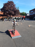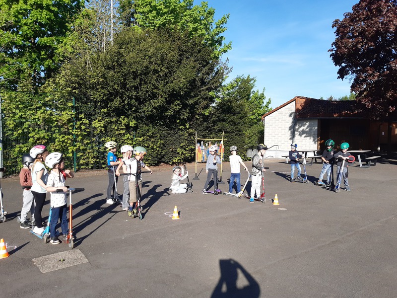 In der letzten Aprilwoche war das RollerKids Mobil an unserer Schule. An diesen Tagen konnten alle Kinder täglich Roller fahren und dabei auch einige Tricks lernen. Zunächst wurde fleißig das Bremsen geübt. Anschließend ging es im Slalom um Hütchen, über eine Rampe, unter Stangen hindurch oder auch über eine Wippe. Die Kinder fuhren einhändig oder mit einem Bein über dem Lenker. Einigen gelangen sogar kleine Sprünge mit dem Roller.