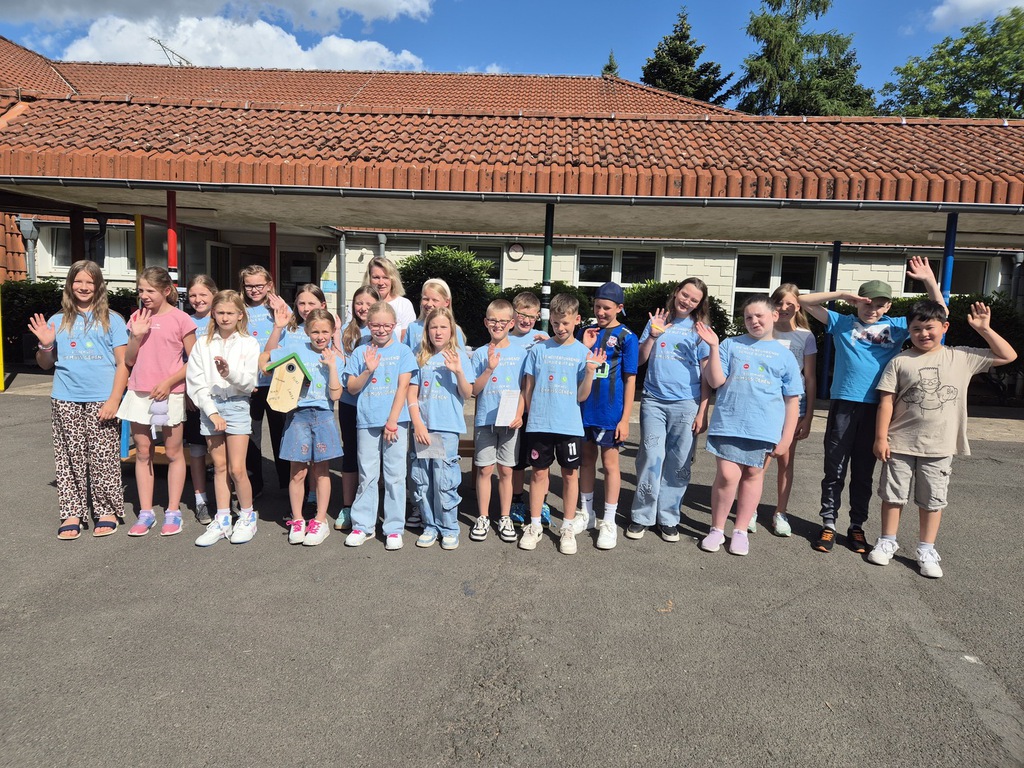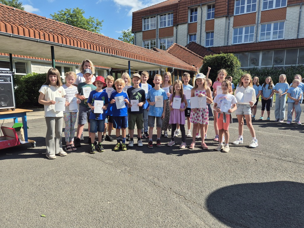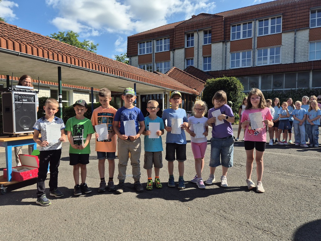 Am letzten Schultag vor den Ferien treffen sich immer alle Kinder und Lehrlräfte auf dem Schulhof. Zum einen werden dann unsere Viertklässler verabschiedet, zum anderen ist dann auch an der Zeit, Urkunden zu verleihen. In diesem Jahr wurden die Antolin-Sieger der einzelnen Klassen nochmals geehrt und die Urkunden der Bundesjugendspiele wurden ausgegeben. Wir sind stolz, so fleißige Sportler und Leser an unserer Schule zu haben.