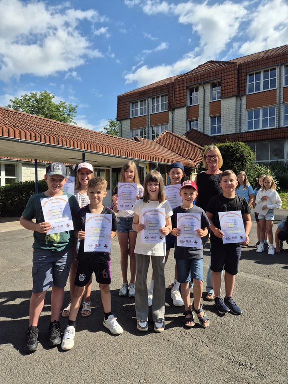 Kurz vor den Sommerferien fand an unserer Schule die Übergabe der Sport- und Laufabzeichen statt. Schulleiterin Silvia Röll-Grätz und Andrea Fitzke überreichten die Urkunden an die engagierten Sportlerinnen und Sportler der Leichtathletik-AG, die immer montags am Nachmittag trainierten.