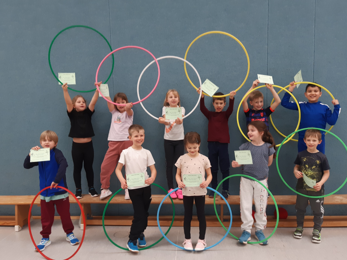Die Schülerinnen und Schüler der Klasse 1a beschäftigten sich zuletzt im Sportunterricht intensiv mit dem Gymnastikreifen. Sie probierten verschiedene Übungen wie Hula-Hoop, das Drehen und Rollen des Reifens, waghalsige Sprünge durch den Reifen sowie abwechslungsreiche Partner- und Gruppenspiele aus.