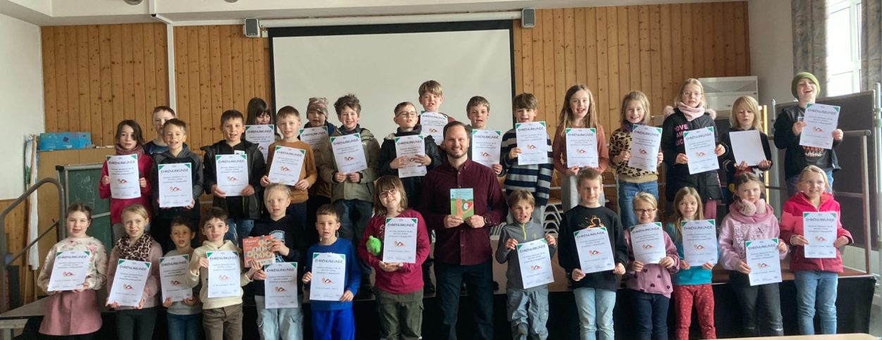 Diese Aktion wurde vom Vogelsbergkreis ins Leben gerufen. Am 18.02. 2026 war es endlich soweit. Der Bewegungskoordinator des Vogelsbergkreises, Herr Günther kam an die Windbergschule und überreichte den fleißigen Kindern ihre Urkunden sowie jeder Klasse ein Bewegungsspiel.