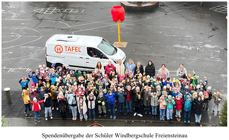 Im Zeichen der Nächstenliebe und des sozialen Miteinanders hat die Windbergschule in Freiensteinau während der Adventszeit eine Weihnachtsaktion „Hilfe für andere Menschen in der Region“ zugunsten der Lauterbacher Tafel durchgeführt. Mit großem Engagement wollten die Schülerinnen und Schüler Menschen in der Region unterstützen und setzten dabei ein starkes Zeichen der Solidarität. Gemeinsam mit ihren Familien wurden haltbare Lebensmittel erworben, z. B. Konserven, Marmelade, Eintöpfe, Suppen, Müsli, Cornflakes oder auch weihnachtliche Leckereien, und anschließend den Klassenlehrinnen übergeben.
